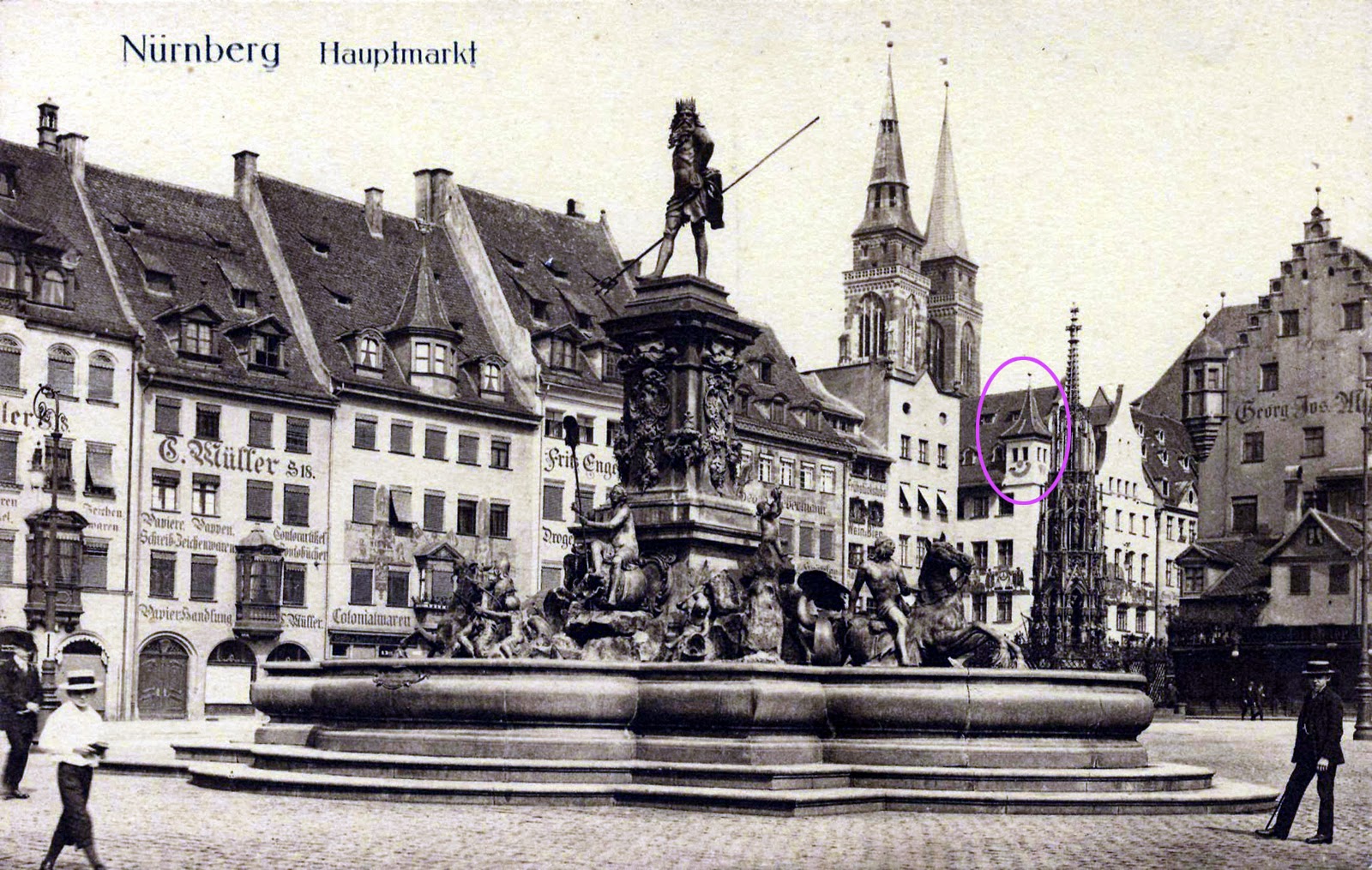 1349-ig az egész tér és a környéke képezte a Zsidónegyedet. Nehéz elképzelni, de ezekben az időkben, a mostani Frauenkirche (ennek karzatán tartja minden évben híres Prolog beszédét a nürnbergi Chritskind, amivel a Nürnberger Christkindlesmarktot megnyitja) helyén egy zsinagóga állt. Ezt a zsinagógát és a környező zsidó házakat 1349-ben, a zsidóprogrom idején lerombolták. Azt beszélik, a zsinagógából megmaradt néhány kő (de az is lehet, hogy kristály), amiket a mai napig fel lehet lelni a Frauenkirche templomban. Bár lehet, ez is olyan helyi legenda, mint a Hitler-szobája a Hotel Deutscher Hof-ban. Tény, hogy Hitler mindig ott szállt meg, de azt a szobát, ami neki alakítattak át, senki nem ismeri. Vagy csak fosnak, nem árulják el, nehogy kiengedjék a dzsinnt a palackból és induljon a neonáci hülyegyerekek zarándoklata a messiásuk szobájához.