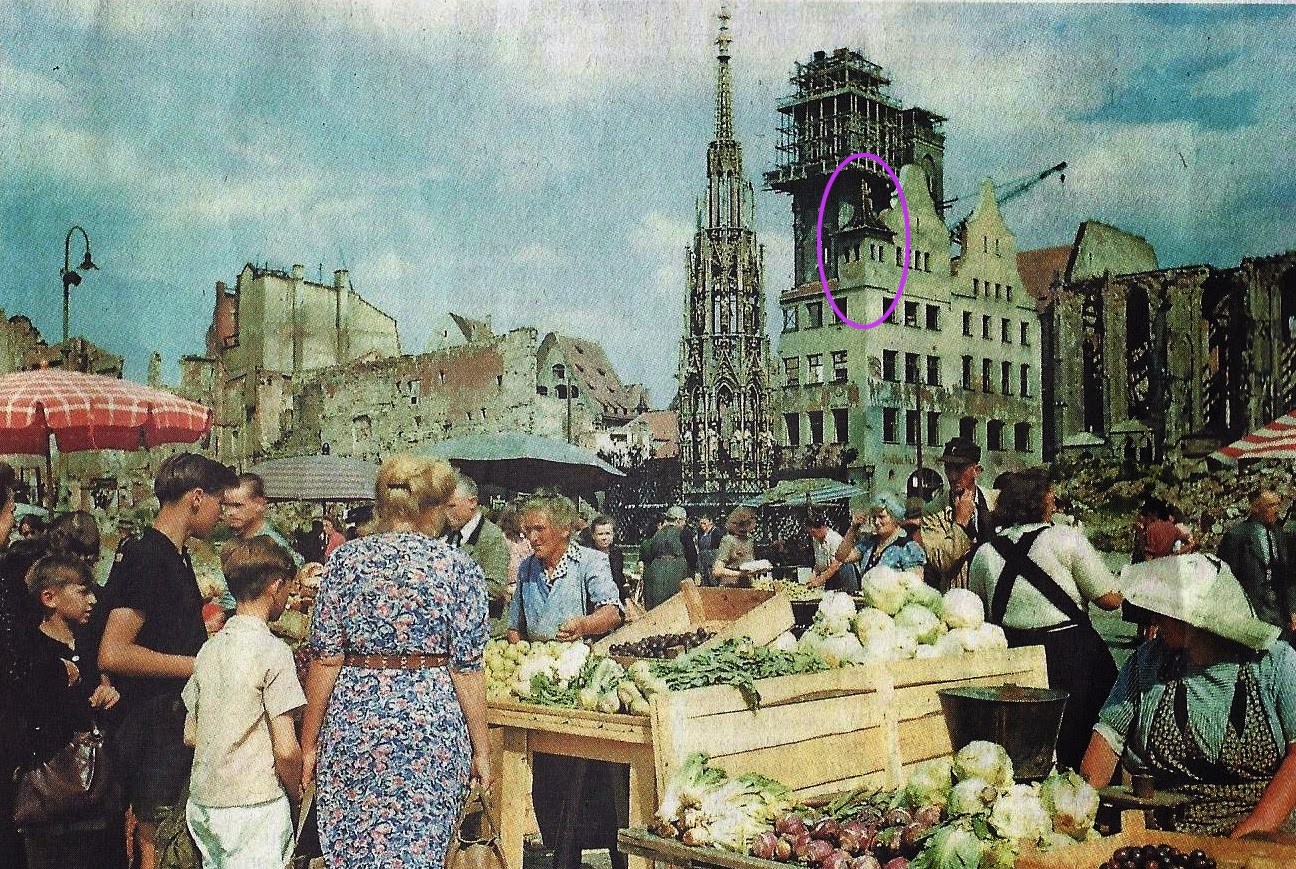A képen látható a Neptun-kút, de nézzétek meg a háta mögötti, lila körrel megjelölt kis tornyocskát is! Ez a nürnbergi IHK (Ipar és Kereskedelmi Kamara) tornyocskája, nekem csak a kis „nevető faszi”. Nézzétek meg, a következő képeken jobban látszik, ez egy arc! A két ablak a szemei, az alatta levő napóra pedig a kis szája, ami mindig nevet. Ez a kis nevető faszi már sok mindent látott. Átélte a háborút, a bombázásokat, az ínséges időket, koncerteket, vásárokat. Onnan fentről figyeli a Hauptmarktot, az embereket és egyre csak nevet.