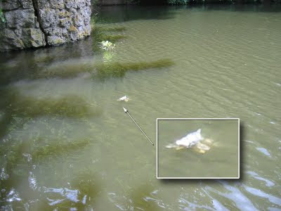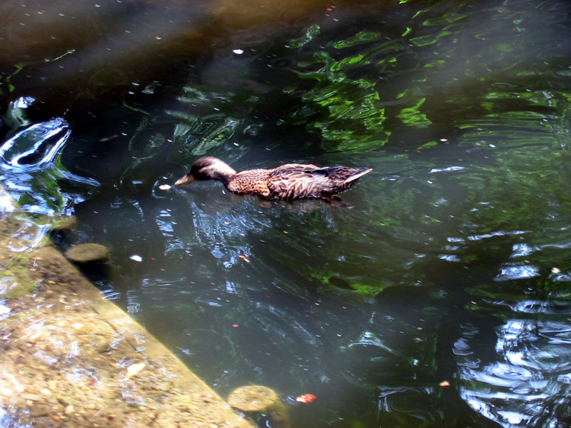 Ellenfelük is akad kacsáéknak, mégpedig a vízben élő pontyok, akik legalább annyira éhesek, mint a kollégák. 🙂 A vízbedobott zsemledarabokra ők is igényt tartanak. Megfigyeltük, a kacsákat sikerül is néha elijeszteniük. A halak magasan kiemelkednek a vizből, úgy csócsálják, illetve teszik magukévá a zsákmányt.