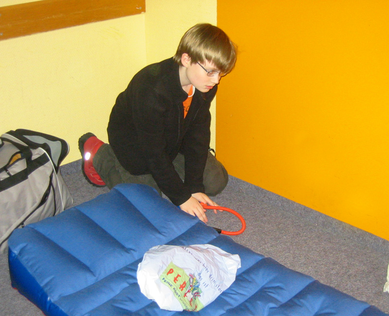 Már az osztályteremben járunk. A képen a felfújható ágyikó és a gyermek, aki éppen manuálterápiával fuvatja felfelé az alvóalkalmatosságot.